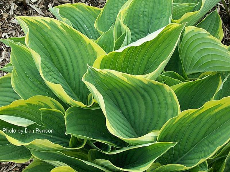 This yellow margined sport of the popular 'Empress Wu' forms a very large clump of slightly cupped green leaves with a bright yellow margins. Grows 28" tall x 60" wide. Lavender flowers.