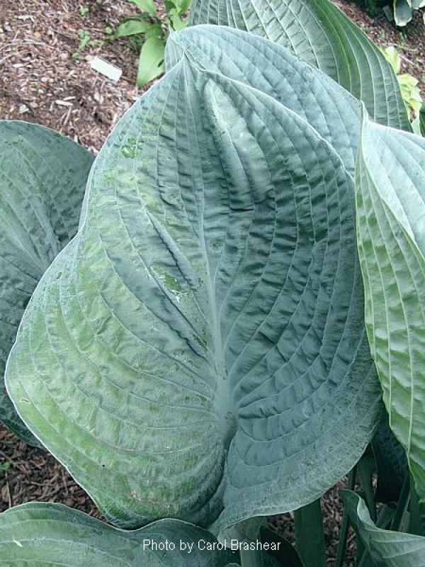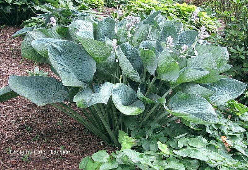 A huge, upright hosta that grows quickly into an impressive specimen. The deep blue-green, corrugated, cupped and twisted foliage forms a vase-shaped mound that can reach 46' tall and 70" wide. Thick foliage is slug resistant. Lavender flowers in early summer.