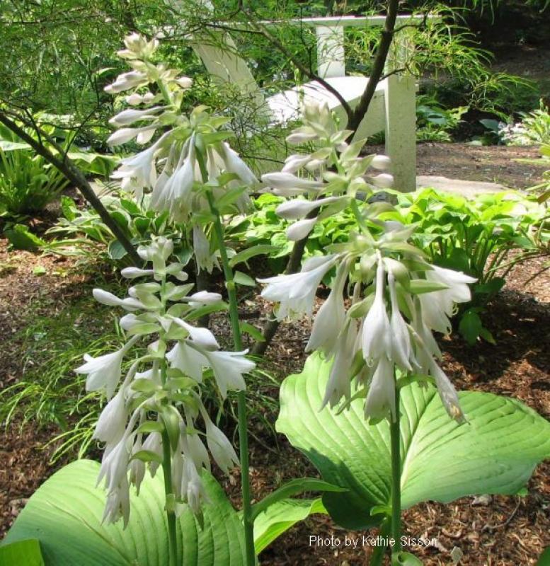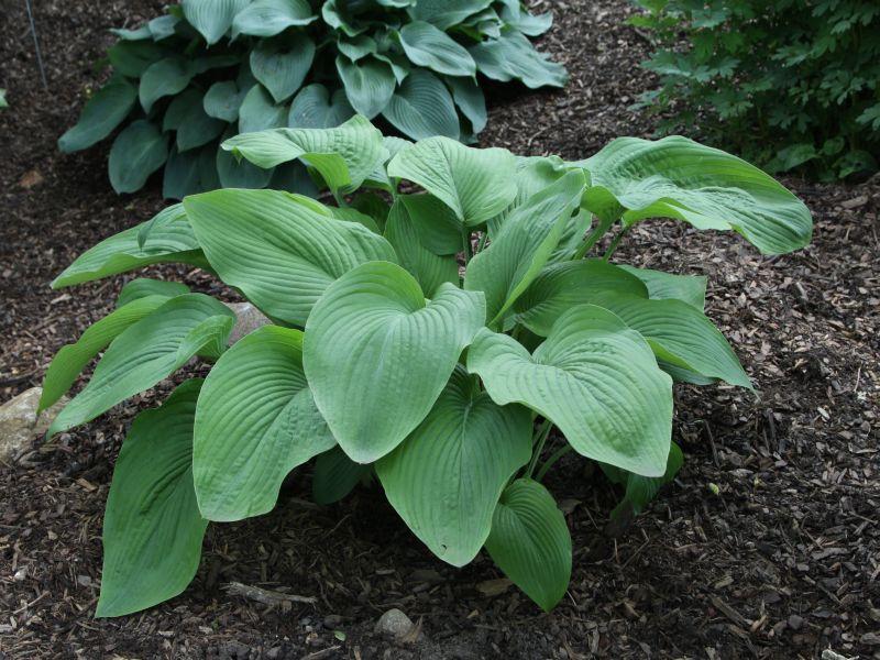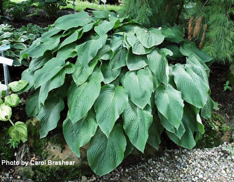 A gargantuan-sized hosta with gigantic green leaves. It takes a while to get there, but it can grow to 36" tall and 80" wide. Give it water and give it room!. Large white flowers appear in early summer, held well above the foliage.