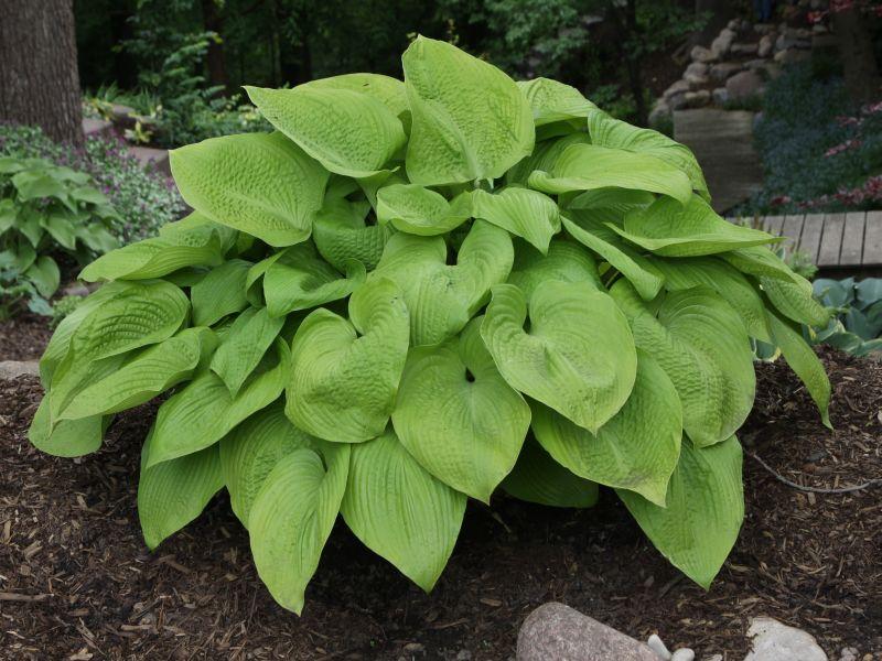 'Krugerrand' grows into a sensational, large, upright mound of bright gold foliage that is beautifully corrugated. It's a very impressive yellow specimen. Grows 30" tall and 60" wide. Lavender flowers in mid summer.