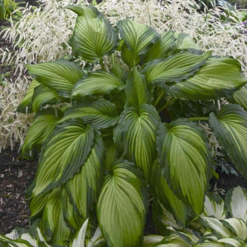 A variegated sport of the multiple award winning solid green Hosta ‘Niagara Falls’. If you like ‘Bridal Falls’, try this new large hosta for its reverse variegation. ‘Angel Falls’ forms an attractively rounded mound of cascading green leaves with beautiful white centers. The green margins measure up to 2” wide, with a lighter green area appearing where the margins and centers overlap. The mature leaves arch downward with a rippled margin. Light lavender flowers appear in midsummer. Grows 24” tall and 38” wide.