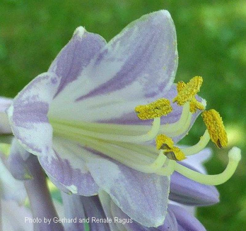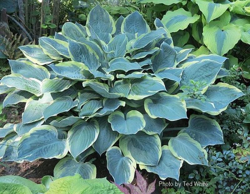 Glossy, blue-green, cupped leaves with slightly rippled yellow margins in spring. More of a gray-green with creamy white margins by summer. A sieboldiana type with good substance, it becomes more impressive with its unique coloration as it matures. Grows 14” tall and 32” wide with lavender flowers in mid summer.