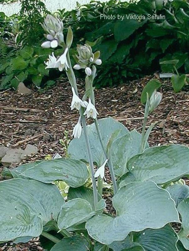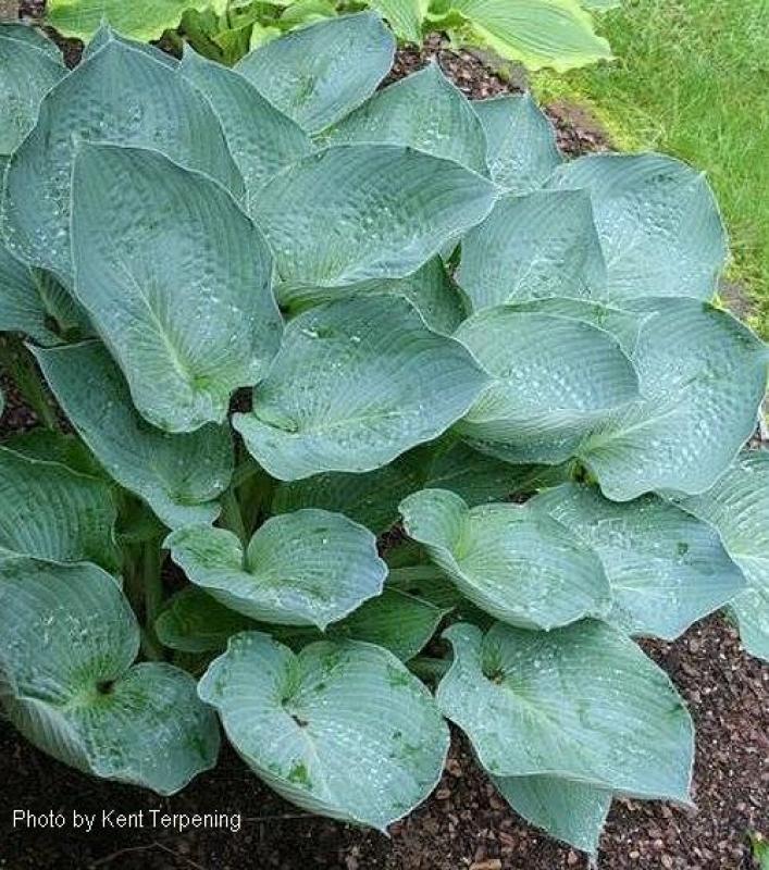 A large, upright clump of large, deeply cupped, blue leaves with undulating margins. Good substance. Grows 26” tall and 36” wide. Lavender flowers in early summer.