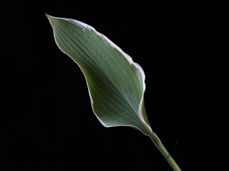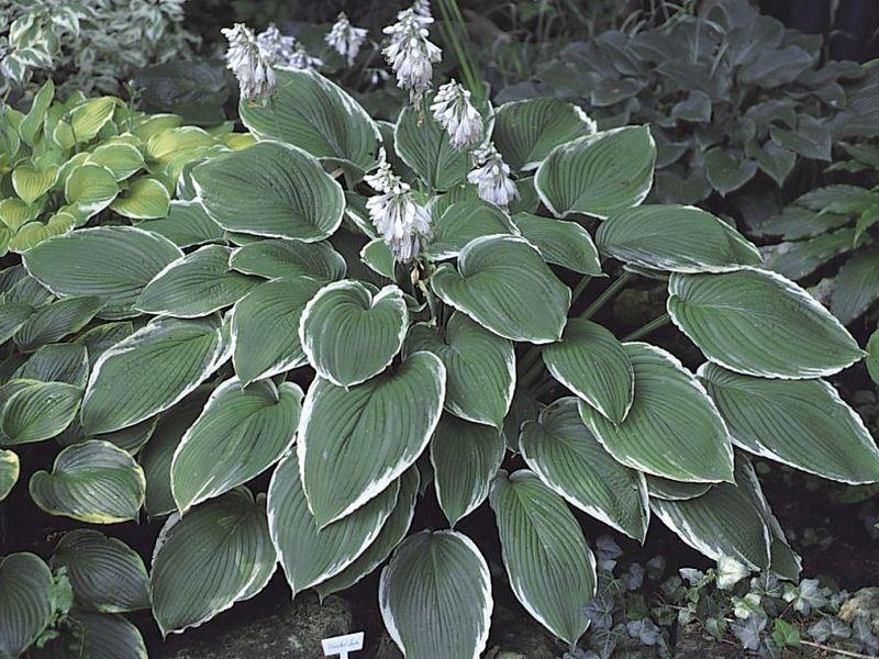 The frosty, gray-blue-green leaves have distinct white margins and grayish jetting into the centers of the leaves. This very large hosta is a choice specimen when it matures. Grows 32" tall and 63" wide. Near white flowers in early summer.