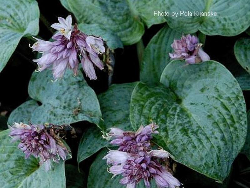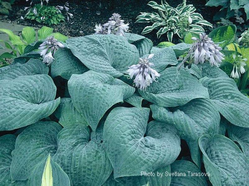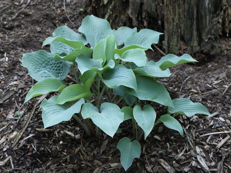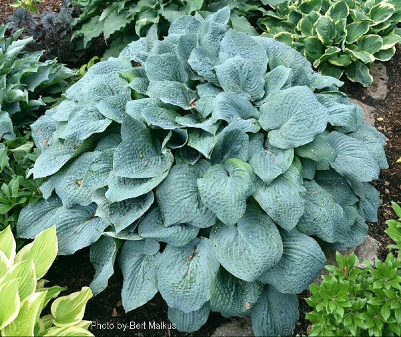 ‘Blueberry Muffin’ is a strong grower and reliable performer. It’s long-lasting blue foliage forms a medium sized mound of rounded, puckered, slightly wavy leaves with attractive light mauve petioles and matching mauve flower scapes. Grows around 15” tall and 40”wide. Lavender flowers in summer.