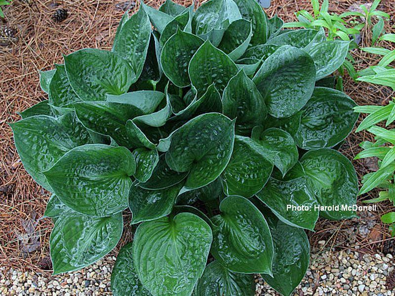 Nicely pebbled, almost perfectly round leaves are deep green and gently cupped. It really shows off when paired with gold or powdery blue hostas. Grows 16" tall and 30" wide. Lavender flowers in mid summer.