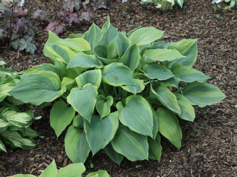 The leaves of this jewel are blue-green with yellow margins. The wedge shaped foliage has good substance and wavy edges. Grows into a good size clump 22" tall and 50" wide. Lavender flowers in early summer.