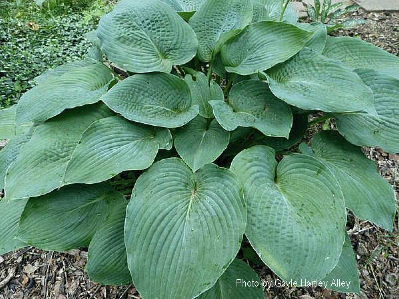 ‘Quilted Skies’ has silvery blue, wedge shaped leaves with excellent corrugation and substance. It is sometimes listed as being 26” tall and 48” wide, but it hasn’t grown like that for us. More like 22” tall and 38” wide. Lavender flowers in summer.