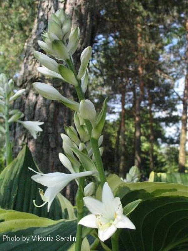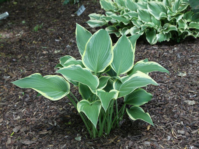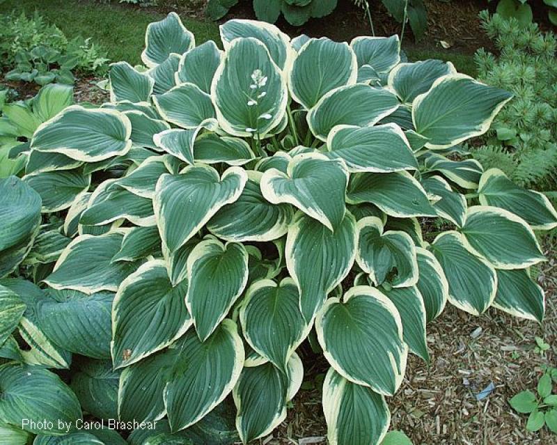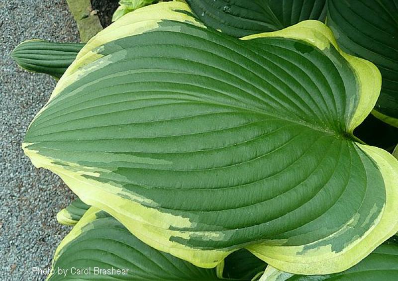 A large, beautiful, vase shaped clump of dark green leaves with flowing yellow margins. The margins turn creamy in summer. Grows 24" tall and 50" wide. White flowers in mid summer.