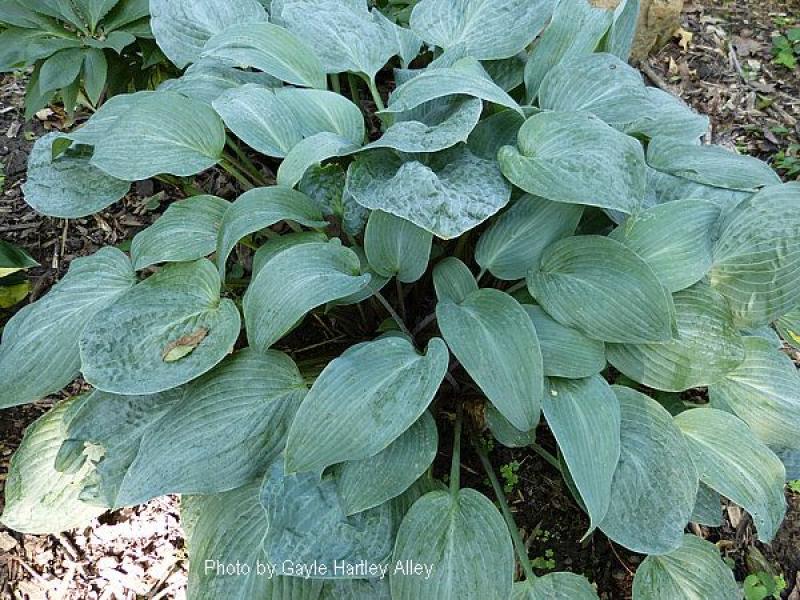 The extremely blue color of ‘Carolina Blue” holds well into summer. The waxy foliage and powdery blue color show that it has ‘Halcyon’ in its breeding. Leaves are held on purple petioles and form a beautiful, dense mound. A fast grower to 16” tall and 30” wide. Lavender flowers on purple scapes in mid summer.
