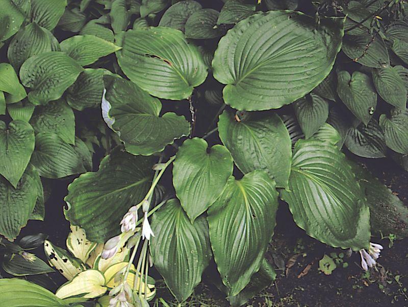 This is a hosta we acquired many years ago under this name. We don't have much information about it, but it has been a slow grower for us. According to hostalibrary.org, hypoleuca in Japan is called Urajiro Giboshi, the "white-backed hosta". Whatever we have, it has pointed, gray-green leaves with whitish undersides. We estimate that it grows 15" tall and 36" wide. Lavender flowers in summer.
