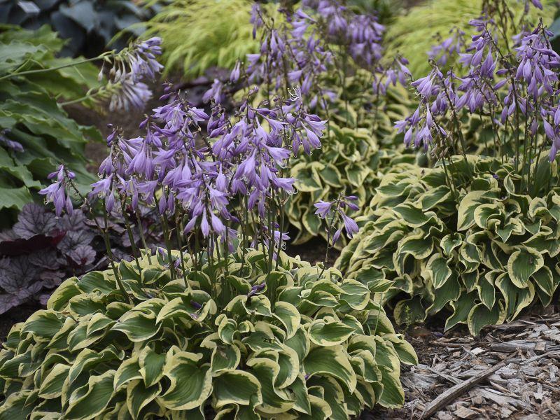The dark green leaves have creamy yellow margins in spring that mature to creamy white in summer. This is an excellent sport of 'Pilgrim' with showier and wavier margins. It's a vigorous grower to 9" tall x 29" wide. Nice lavender flowers on 15" scapes in early to mid summer.