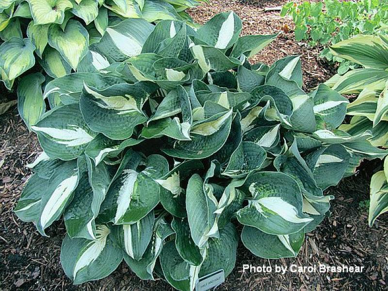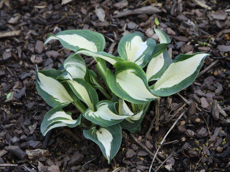A sport of 'Lakeside Cupcake' that is brightly variegated right away in spring. The dark green margins, pure white centers, and nice light green jetting in between make for a very showy, small hosta. Leaves have a twist to them. Grows 12" tall and 19" wide. Near white flowers in summer.
