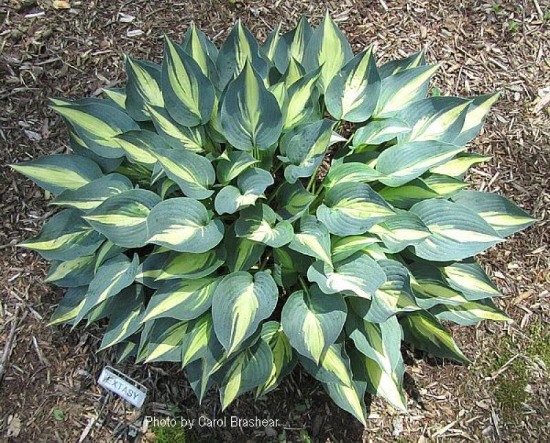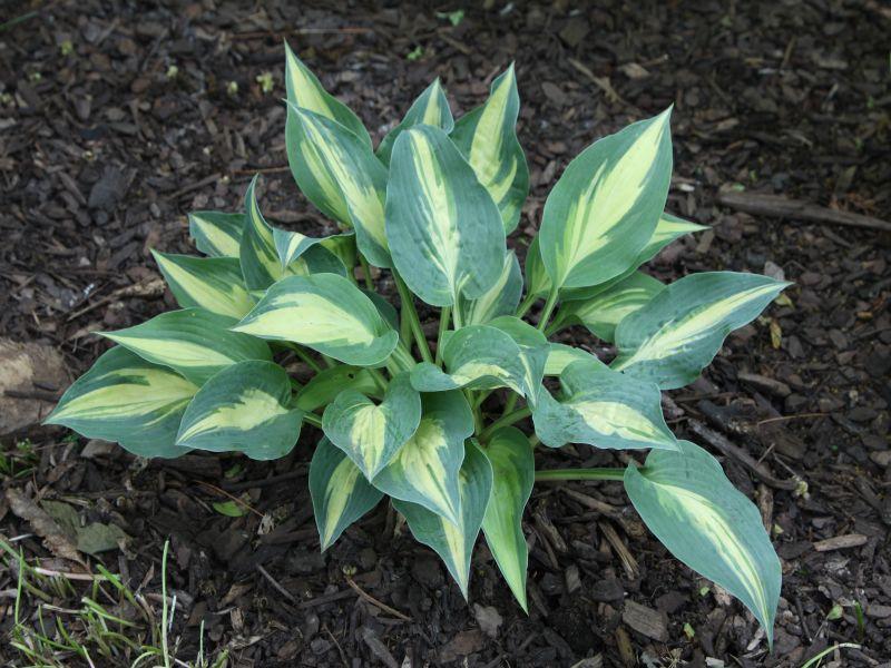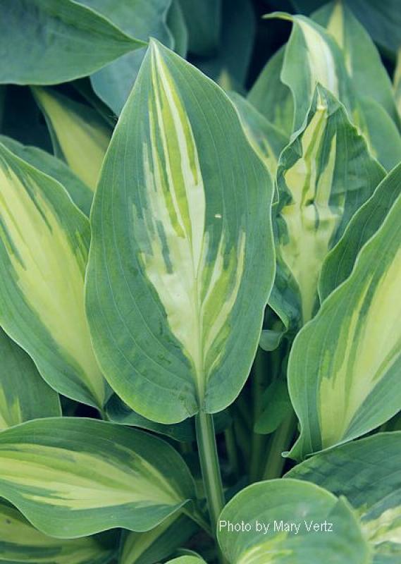 Creamy-white centers bordered with wide, blue-green margins. The centers start more yellow in spring, but quickly turn to white. The flashy variegation and upright growth habit make it a garden show-off. Grows 10” tall and 17” wide. Lavender flowers in summer.