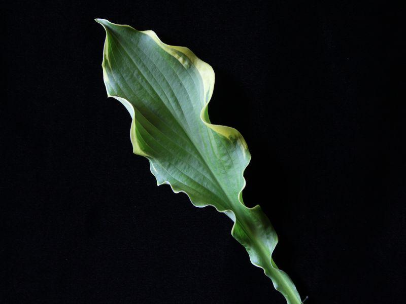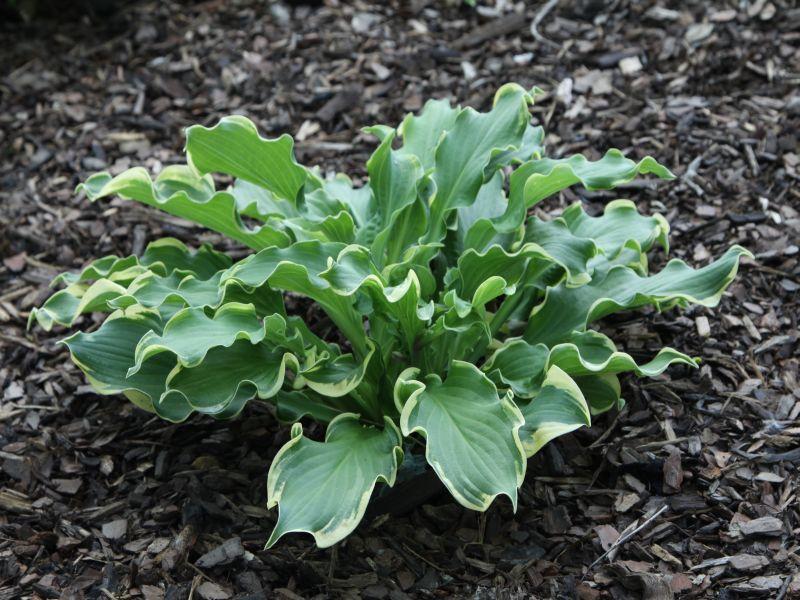 Extremely wavy leaves from the crown out to the leaf tips. The leaves have heavy substance and are green with creamy margins. Definitely, a unique look. It forms a small clump 12" tall and 28" wide. Lavender flowers are held on purple scapes 24" high in mid summer.