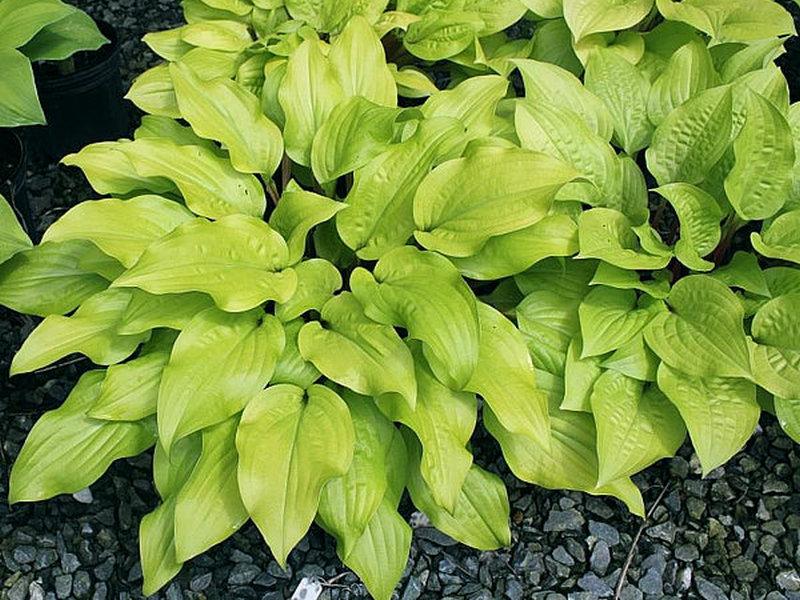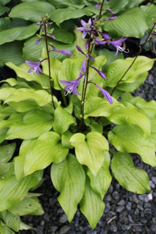 'Mango Salsa' has unusual, wavy, yellow leaves with deep red petioles. It is pretty sun tolerant, which will bring out the yellow color. Grows 12" tall and 20" wide. Red scapes hole purple flowers in summer.