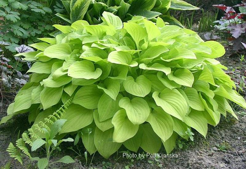 This all gold form of 'Golden Tiara' is bright yellow in spring, turning to more of a chartreuse in summer. It's a vigorous grower and fast increaser, working well as a border. Grows 14" tall and 30" wide. Purple flowers in mid summer.
