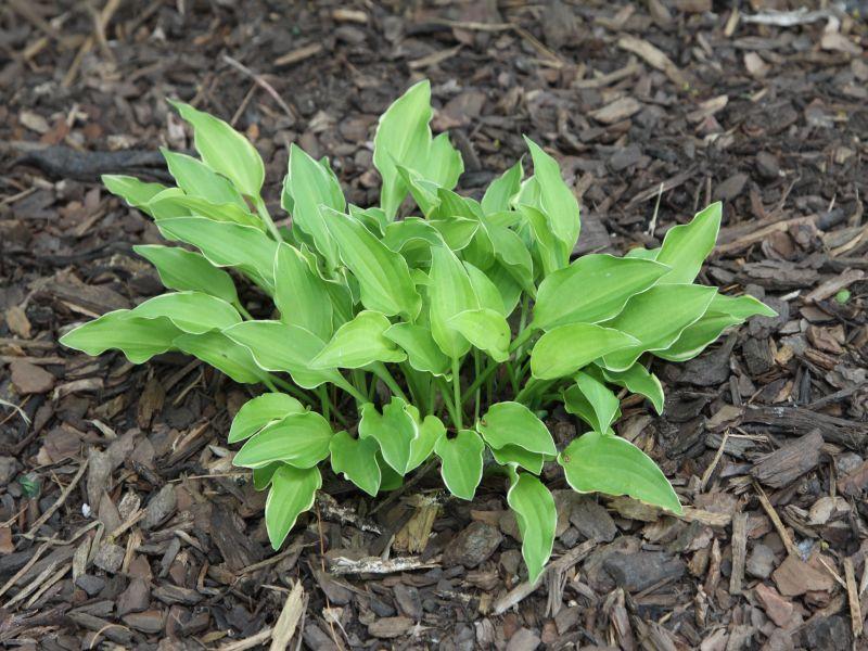 This is a small, dense mound of narrow, rippled, creamy white-margined foliage with chartreuse centers. It can handle some morning sun to help the color pop. Grows 6" tall and 16" wide. It's nicely topped with purple flowers in August.
