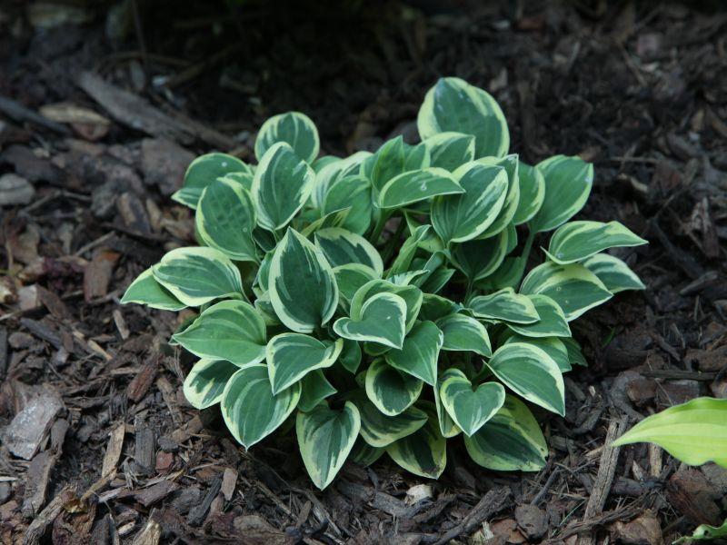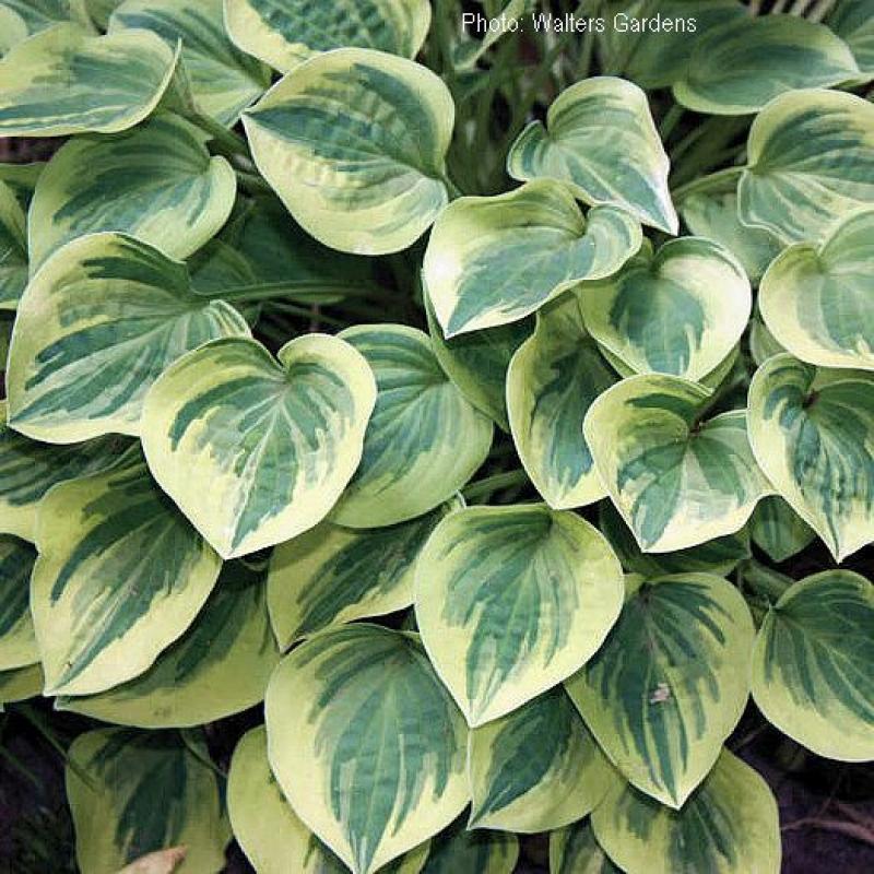 This very cute mini is a sport of ‘Baby Bunting’, and has the reversed pattern of 'Pandora's Box'. The centers are green interspersed with gray, surrounded with irregular, creamy white margins. Grows 4” tall and 8-10” wide. Lavender flowers in late summer.