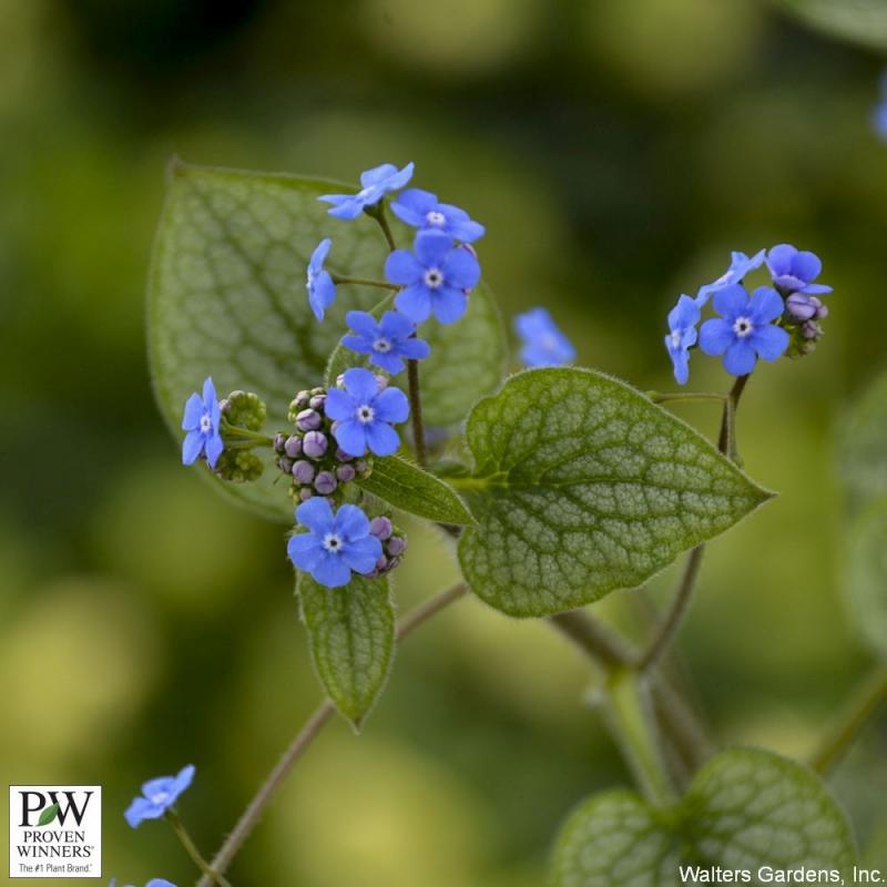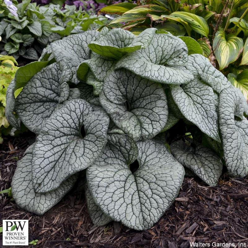 This stunning foliage perennial will be the queen of the shade (and your heart). Compared to its companion plant 'Jack of Diamonds', 'Queen of Hearts' has more heart-shaped leaves and more pronounced silver overlay with narrower bands of dark green veining. From mid to late spring, baby blue, forget-me-not type blossoms are held in clusters above the foliage. Grows best in part shade, where it reaches 16-18" tall and 28-36" wide. Hardy to Zone 3.