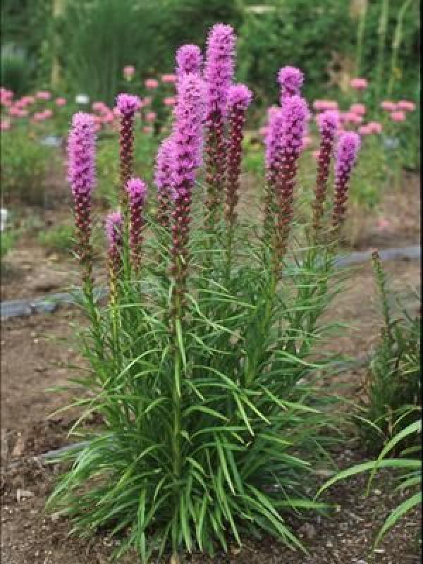 (Gayfeather, Blazing Star) compact plant with spikes of rosy-purple flowers July-September; good cut flower; sun; 24 inches; Zone 3