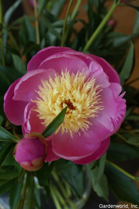 (Garden Peony) fuchsia pink petals create a bowl around the pale lemon yellow center of each bloom; full sun; 30-36 inches; Zone 4