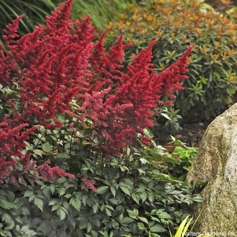 'Fanal' is an arendsii hybrid type, producing red flowers on stem 20-24 inches tall above dark bronze foliage. The foliage is mahogany red in spring, turning dark green by summer. Mulch to hold moisture. Best in part shade. Hardy to Zone 3.