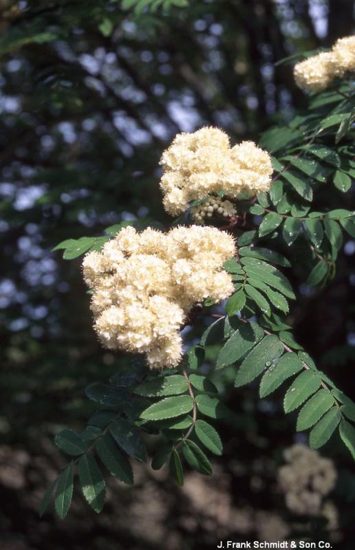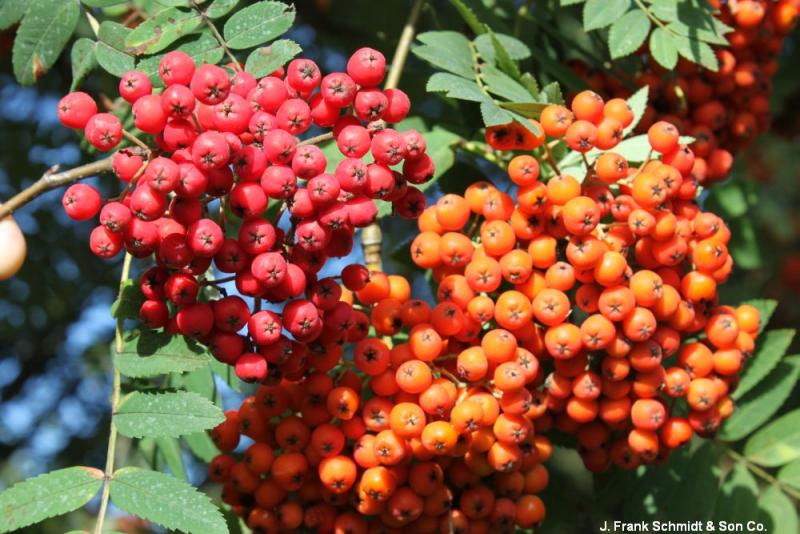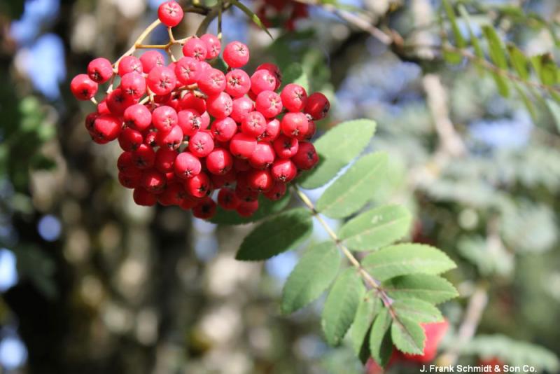 This European Mountain Ash was selected for its clusters of small, brilliant red berries, much more spectacular than the orange of the species. It grows in an upright, oval form. White flowers are followed by the bright red fruit. The dark green foliage turns rusty orange in fall. Grows 35' tall with a spread of 20'. Hardy to Zone 2.