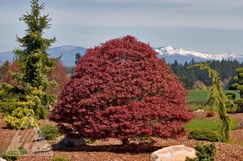 An outstanding new dwarf selection, this upright tree boasts very dense, compact branching, which yields a round-to-ovate outline. It has mid-size, palmate leaves with a bright red, spring flush that darkens as leaves mature. Fall foliage is an eye-catching orange/red, and in winter, dark red stems add drama to the scene. Grows 6' tall and 6' wide in 10 years and will continue to slowly grow larger with age. Best planted in a protected area like the east side of a house or windscreen. Tolerates full sun, but leaves tend to burn in a late hot summer if it receives too much sun. Morning sun with afternoon shade is preferred. Hardy to Zone 5.
