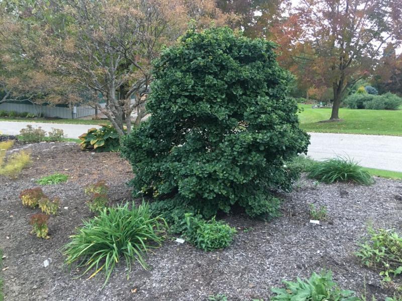 This dwarf, shrubby ginkgo is expected to be 6-8' tall and wide at 10 years. Mature height is still undetermined, it's so new. Unique, butterfly wing shaped foliage is cute. The foliage supposedly turns bright yellow in fall, but the lovely specimen in our gardens, shown here, has not done so, thus far. Different, hardy and fun to grow. Plant in sun to part shade. Hardy to Zone 4.