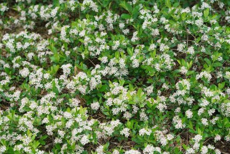 Ground Hug® (sometimes listed as Ground Hog®) is a tough native shrub that grows as a dense goundcover with white flowers in spring and dark purple berries for birds in the fall. The shiny, dark green foliage turns to orange and red colors in the fall. Tolerant of most any soil conditions, it transforms difficult areas into beautiful, low maintenance plantings. It grows 8-14" tall, and gradually spreads up to 3'. It's great for erosion control and weed suppression, growing in full sun to part shade. Deer tend to leave it alone, too. This durable plant is hardy to Zone 3.