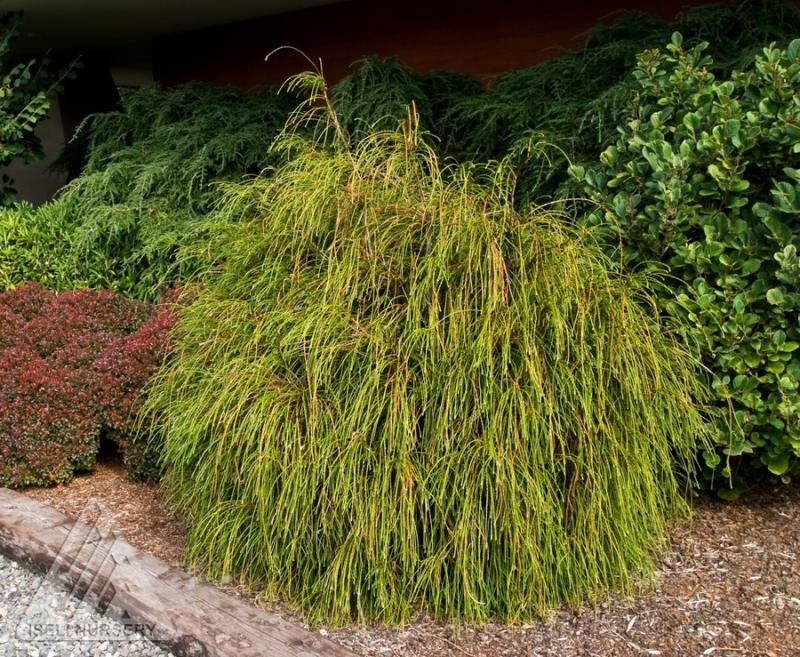 The unusual foliage on this low, mop-head-like plant consists of long, thick, glossy tendrils that suggest Independence Day fireworks. The many branches seem to explode upward and send sparks cascading in all directions. Green in summer, the foliage changes to bronze in winter, matching the richly colored wood. Plant in full sun to part shade. Its mounding habit may reach 4' tall and wide in 20 years. Hardy to Zone 5.