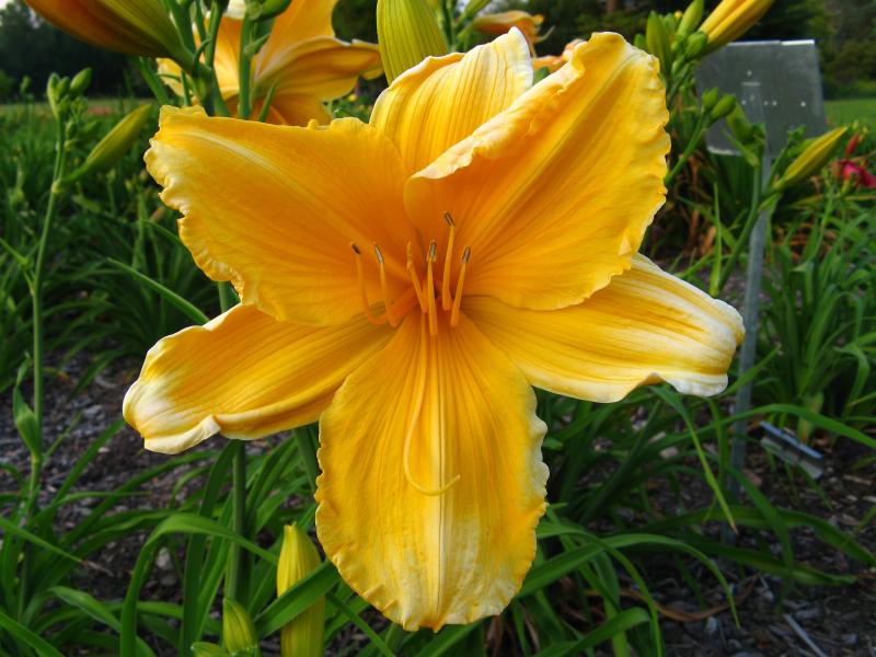 18 inches-E-D-DIP-7 inches; large, ruffled, diamond dusted gold that reblooms reliably until frost