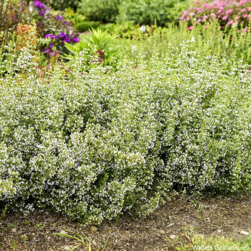 (Calamint) fragrant border plant with tiny white flowers over a bushy habit. lIt blooms from early summer until frost, complementing whatever other perennials are next to it. It grows in full sun to art shade, 12-16 inches tall and wide. Hardy to Zone 5.