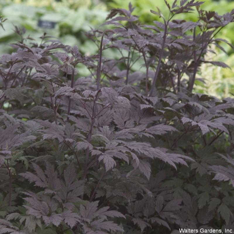Though the young foliage tends to be green, it quickly deepens to an almost iridescent purple-black. In late summer, the 4-7' tall stems are topped with foot-long, fragrant, white flowers blushed with pale pink. Grows best in part to full shade, and is hardy to Zone 4.