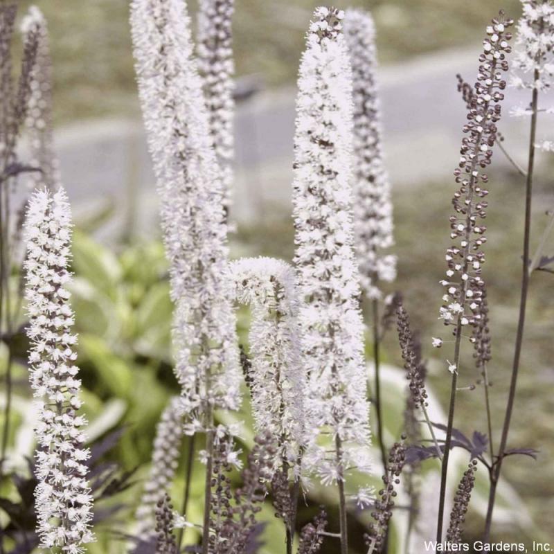 The darkest Cimicifuga to date, 'Hillside Black Beauty' is truly a collector's item. It forms an upright clump of striking, dark purplish-black foliage contrasted by long, white bottlebrush blooms late in the season.