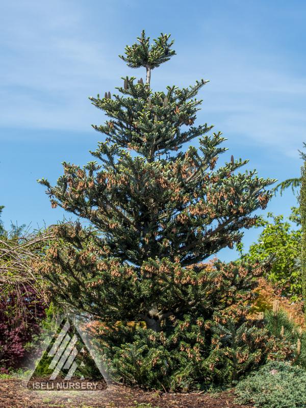 The two-toned needles of 'Silver Show' are so tightly curled that the shoots are almost cylindrical, exposing the extremely white undersides completely. The result is a silver-white element in the garden. The contrasting dark purple cones stand out against the foliage. Showy color and special texture abound. Enjoys full sun to part shade and moist, well-drained soil. Garden size is 12' tall and 8' wide. Hardy to Zone 4.