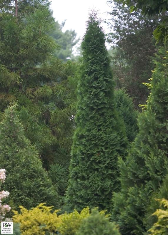This newer arborvitae forms a narrow, green spire with excellent hardiness and dark green winter foliage color. Perfect for hedging or screening, or a single, vertical accent. Good in sun to part shade. Will grow 10-15' tall with a spread of 3-4'. Hardy to Zone 3.