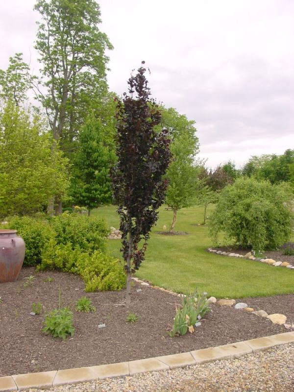 This European Beech has a columnar, fastigiate form with gorgeous purple foliage. It fits into smaller spaces and makes a great vertical accent. Sometimes referred to as a "copper beech" because the spring foliage absolutely glows with a coppery red color in the early morning and late afternoon sun. Then the foliage turns to the dark color that it holds for the rest of the season. Grows 40' tall and only 12' wide. Hardy to Zone 5.