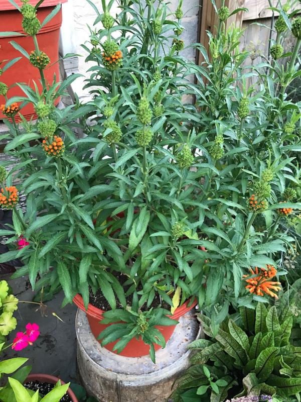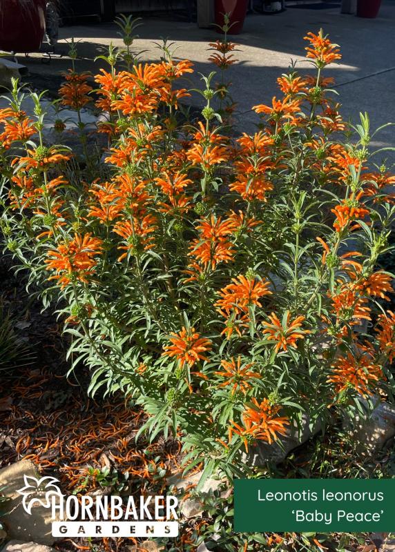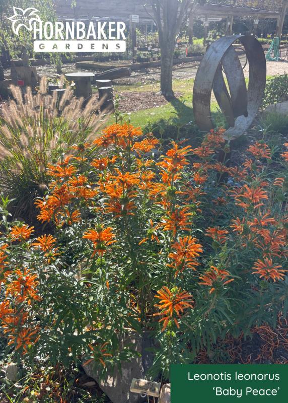 Leonotis leonorus 'Baby Peace' - Annual specimen plant with fiery orange blooms throughout the summer which resemble a lion’s mane. Perfect in mixed containers or as a focal point in the ground. When we plant this near the checkout and shop we get asked about it all season long! Grab one before they sell out.