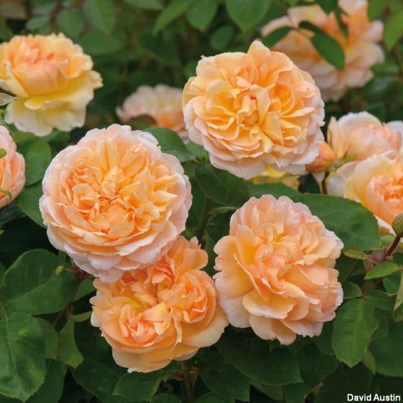 A David AustinĀ® English Rose. This lady bears large, quartered rosettes, each about 4" across, packed with loosely arranged petals. The blooms are a beautiful shade of pure apricot, paling towards the edges. There is a lovely Tea fragrance, with hints of cedar wood and vanilla. Forms a shrub 4' tall and wide. Hardy to Zone 5.