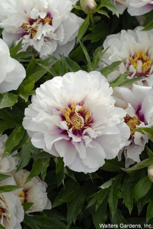(Intersectional Peony) cross between garden peony type and tree peony type; fragrant, 6-8 inch white flowers with darker flares; semi-double to double; no staking required; 24-30 inches; full to partial sun; Zone 4