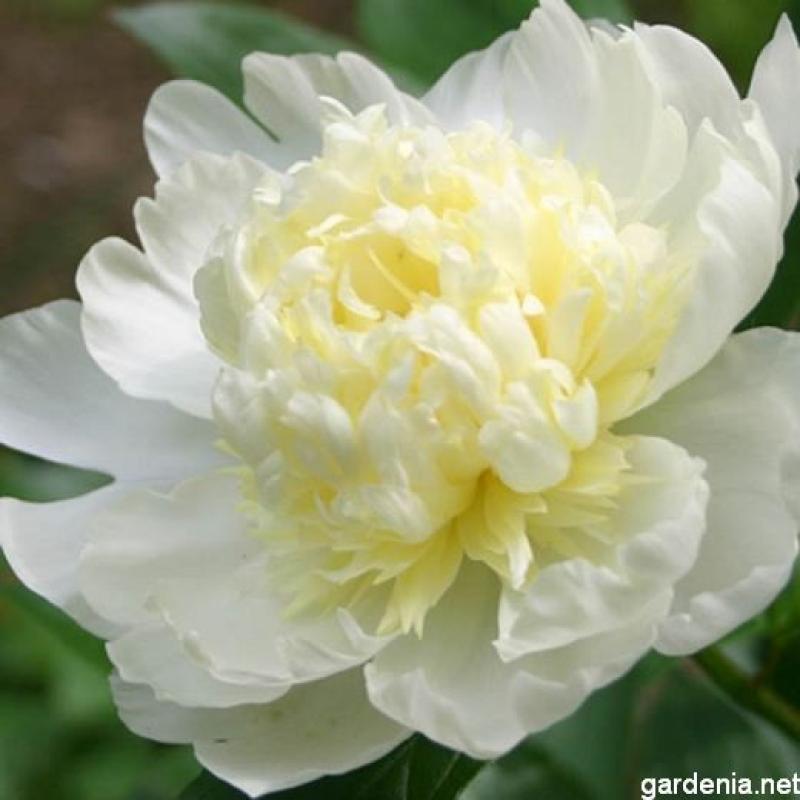 (Garden Peony) a double form with creamy-white outer petals and a pale lemon-yellow center; fragrant; early-midseason bloomer; 30-36"; full sun; Zone 2