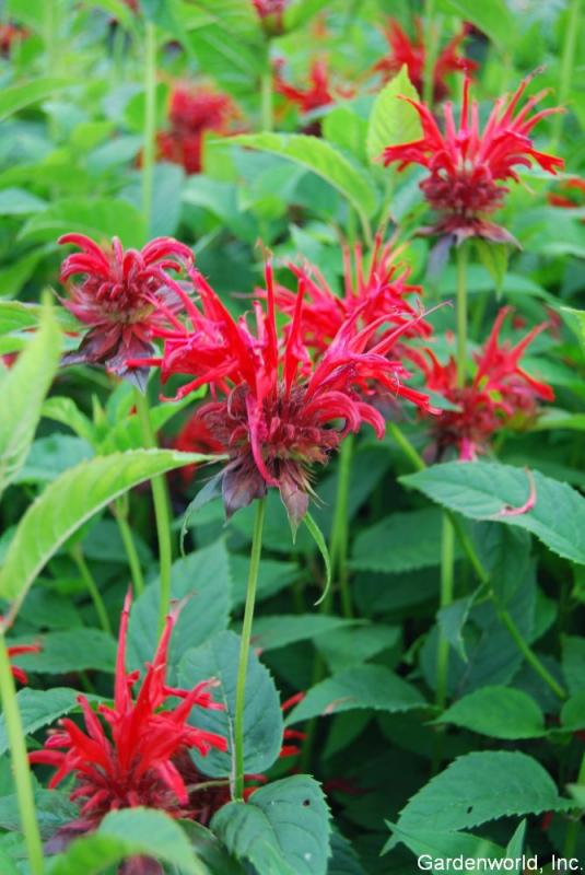 (Bee Balm) large red flowers in July; one of the best mildew resistant varieties; attracts butterflies; sun; 3-4 feet; Zone 4