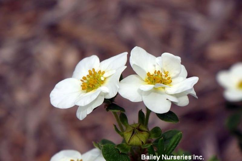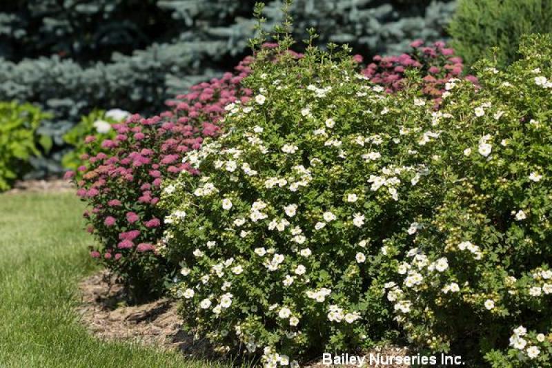 Add some pop to the landscape with this double flowering potentilla. Bright white flowers adorn this rounded shrub throughout the entire summer. Dark green foliage contrasts beautifully with the flowers. Trim back by up to a third in early spring to maintain dense, rounded shape. Deer resistant. Best in full sun. Grows 2-3' tall and wide. Hardy to Zone 2.