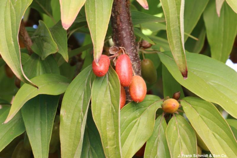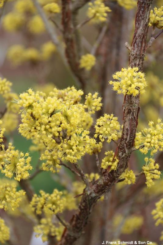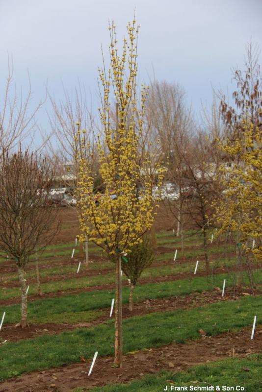 Cornelian Cherry is a hardy, durable, and long-lived species that produces bright yellow flowers in early spring before any foliage has emerged. Dark green foliage turns crimson in fall. Red fruit ripens in late summer, providing snacks for birds. The columnar form grows 22' tall and 12' wide. Hardy to Zone 4.