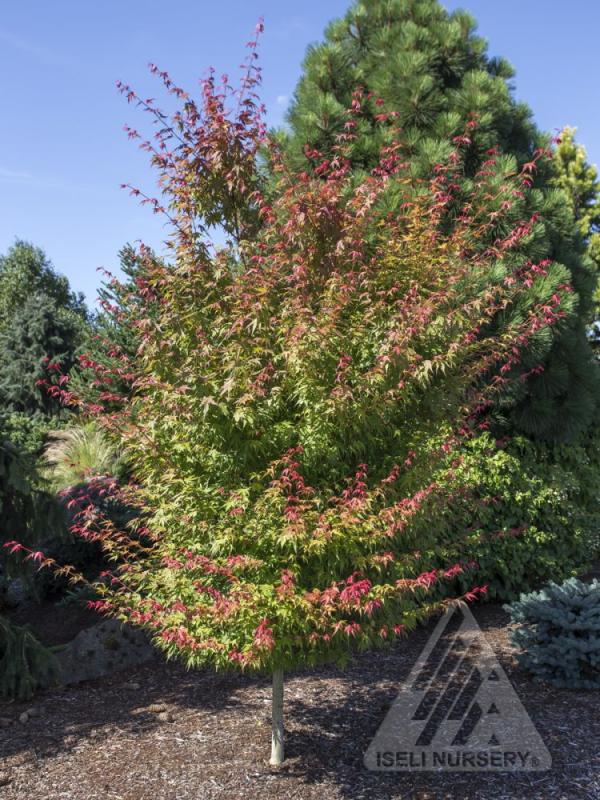 A hardy hybrid of Korean and Japanese maple, combining the hardiness and durability of the Korean maple with the beauty of the Japanese maple. The first leaves of spring explode onto the scene with hot red-orange tones and begin to cool by mid-spring to swirling flames of orange and yellow and then green with hints of red in summer. Small, star-shaped leaves cover the narrow upright tree which broadens with maturity. Plant in sun to part shade. Grows up to 20' tall and 15' wide. Hardy to Zone 5.