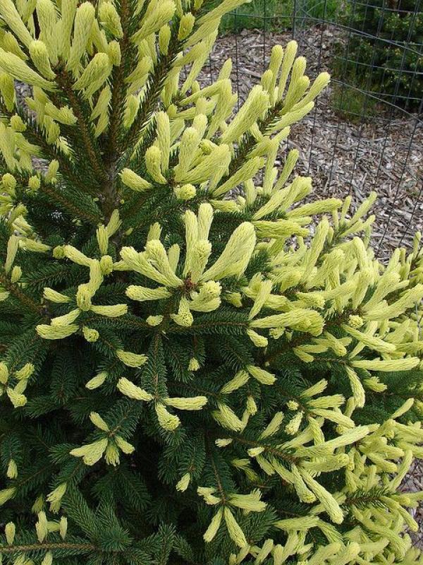 An outstanding selection of White Spruce with small grayish green needles that flush bright yellow new growth in spring, putting on a fantastic show. Small red cones add to the spring display. Best in full sun. Garden size is 20' tall and 15' wide in 10-15 years. Very hardy to Zone 3.