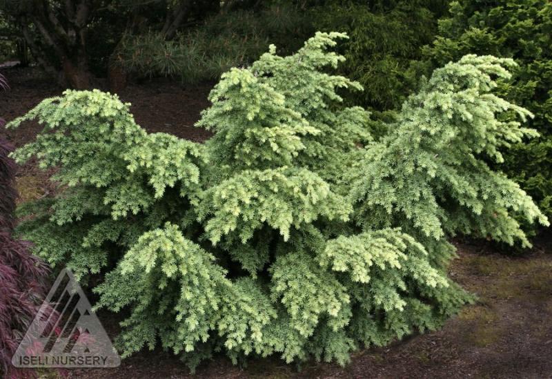 The sturdy branches of this spreading Mountain Hemlock reach out horizontally and soft, short blue needles make the branches look like fine blue bottlebrushes. An unusual low profile and striking year-round color make this choice conifer very desirable. Give it plenty of moisture, excellent drainage, and protection from hot, dry conditions, so it is usually best in afternoon shade. Garden size is 3' tall and 6' wide. Hardy to Zone 5.