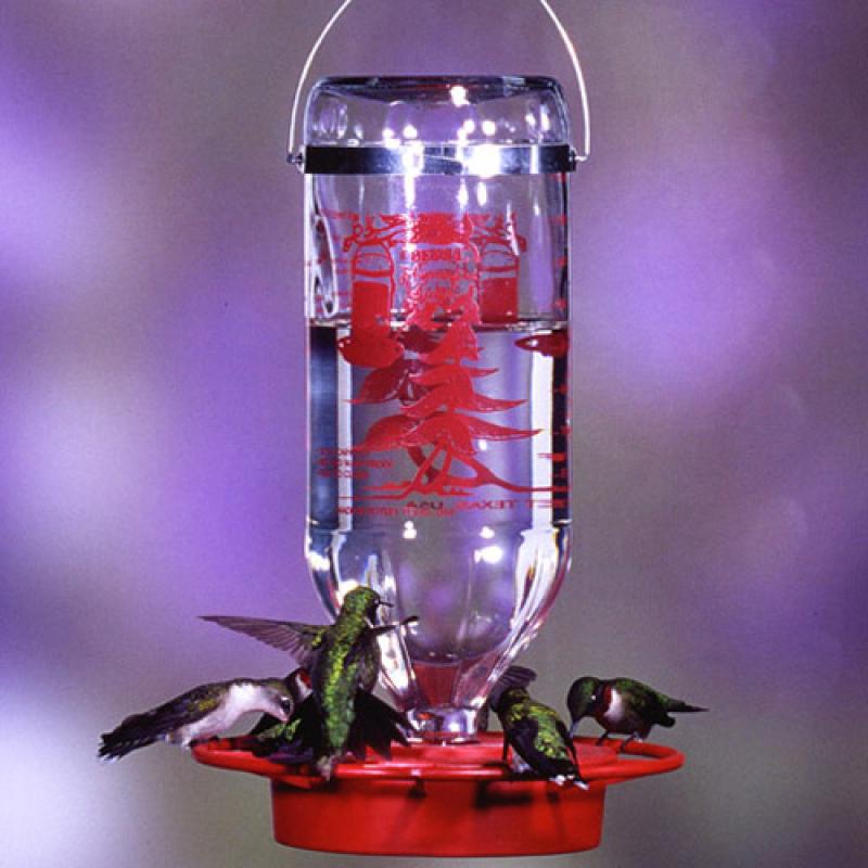 It's different! Hungry hummingbirds perch to drink the nectar. The 6 1/2" diameter red base has eight holes, to feed a crowd. Heavy glass bottle is stable in the wind. Does not drip like plastic feeders. Base comes apart for ease of cleaning. 32 oz. capacity.11" high overall including attached handle.